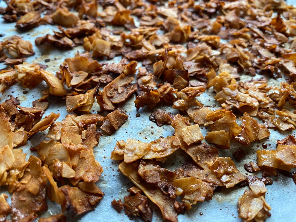 To prepare the chili roasted chickpeas, drain and rinse a can of chickpeas.  Spread onto baking sheet and pat dry with paper towels. This helps make them more crispy. Drizzle with one tablespoon olive oil, or spray with olive oil spray.  Season with chili powder, sea salt and optional garlic powder. Bake in oven or air fryer oven on 425 for 12-14 minutes until desired crispiness