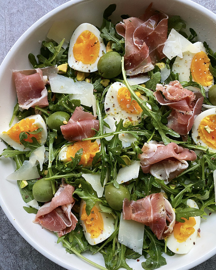 (8) Prosciutto and artichoke hearts, cannellini beans, hard boiled eggs, arugula, lemon juice, olive oil, salt and pepper. The artichoke hearts are store bought marinated from jar.