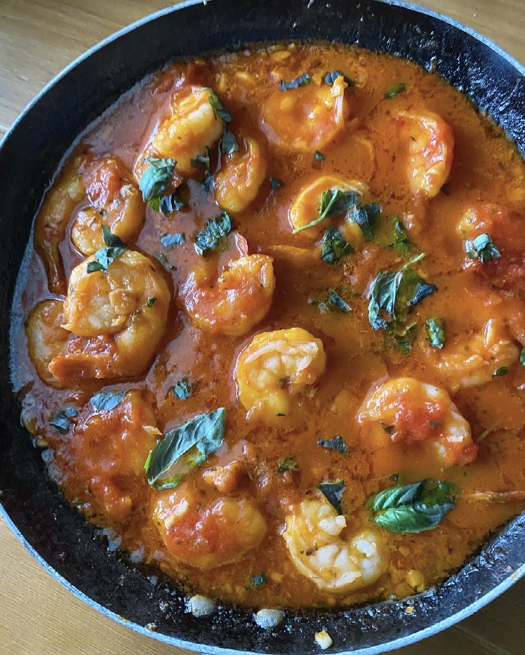 In a bowl add 1/2 pound of raw peeled and deveined shrimp.  Toss with 2-3 Tbsp extra virgin olive oil, juice of a lime, 1 tsp garlic powder, 1/2 tsp salt, 1/2 tsp ground black pepper, 1 tsp. dried oregano.  Let the shrimp marinate for at least 10 mins. Place shrimp on skewers and grill or pan sear for 3-4 minutes on each side until the shrimp turns pink and is cooked through.