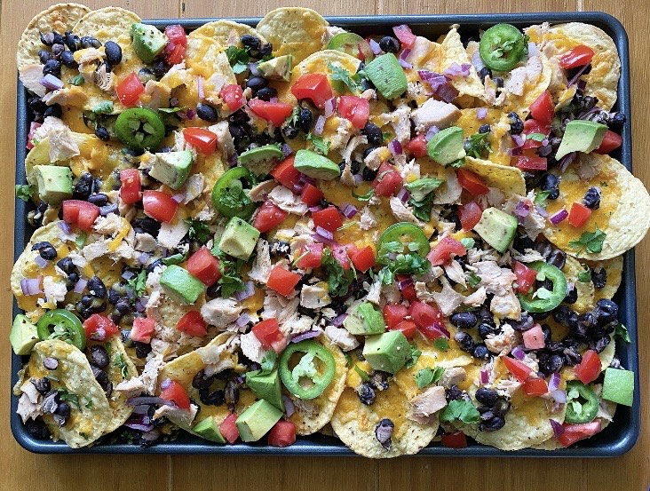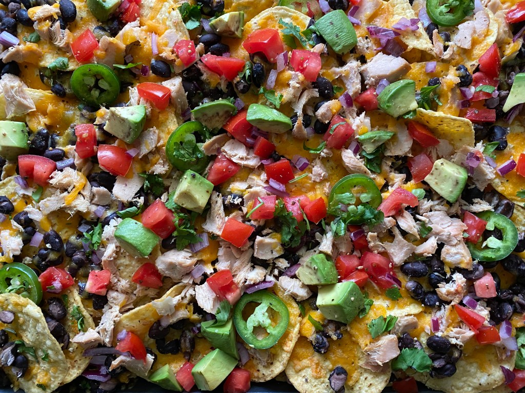 (6) Grilled lemon chicken, black bean, tomato, corn salad, avocado.