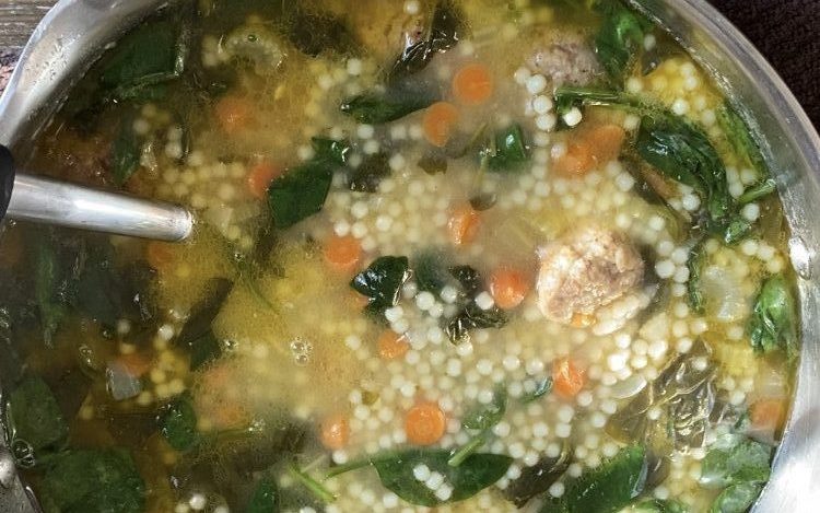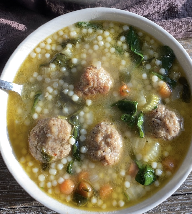 This Italian Wedding Soup is cozy and hearty, packed with delicious flavor.  It’s made with a luscious broth, veggies, meatballs and mini pasta like acini de pepe for a cozy combination of flavors. I used pork sausage for the meatballs, and they worked out perfectly for this soup.
