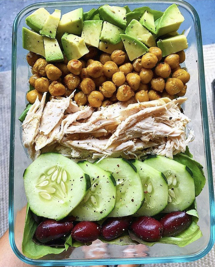 (5) Shredded chicken, cucumber, chili roasted chickpeas, Kalamata olives, avocado and butter lettuce with lemon and olive oil.