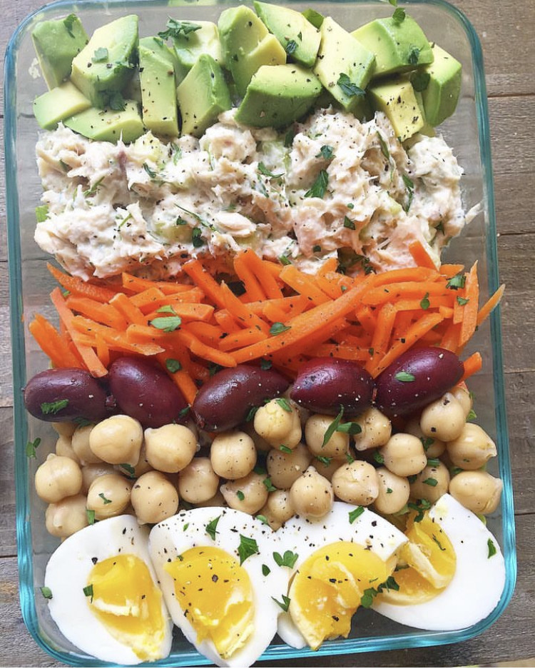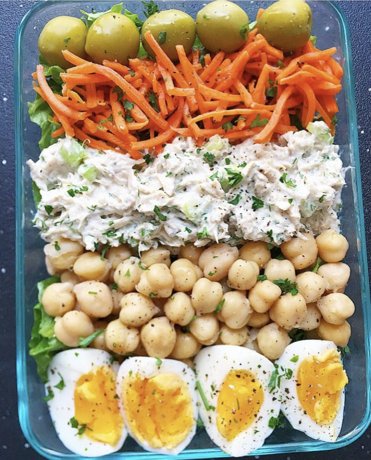 (1) Tuna Salad made with Greek yogurt, hard boiled eggs. carrot, avocado, chickpeas and olives.