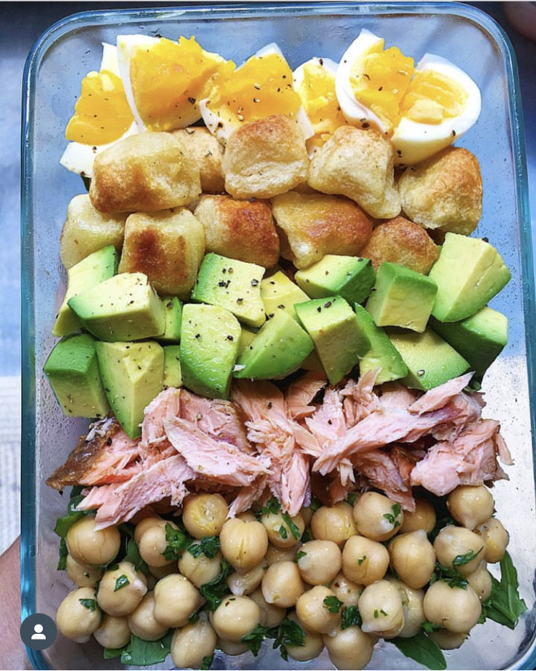 (7) Baked cauliflower gnocchi, flaked salmon, lemon parsley chickpeas, hard boiled eggs.