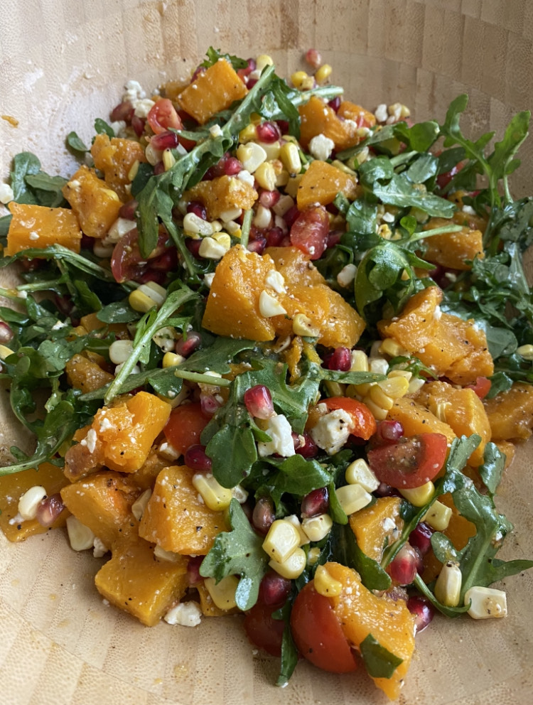 Butternut Squash, Corn Salad with Pomegranate and Maple Dijon Vinaigrette
