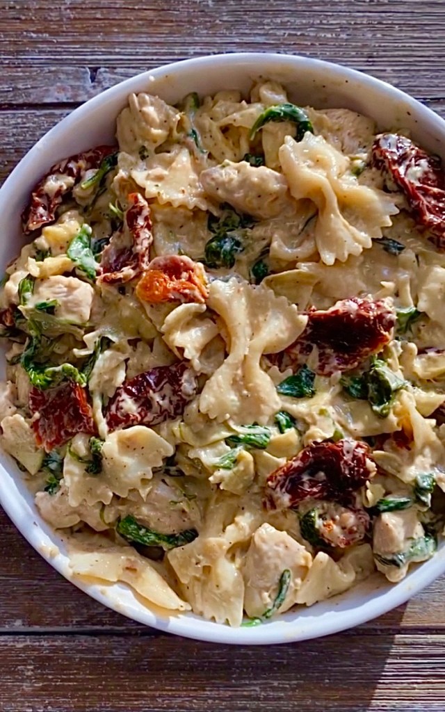 In a deep pan on the stovetop add the butter and heat until melted and bubbly. Add the marinated chicken and garlic and cook for 2-3 minutes stirring occasionally. Stir in the artichoke hearts and then the sun dried tomatoes. Heat throughout and then mix in the heavy cream. Once the heavy cream is heated through mix in the spinach until it wilts. Stir in some grated Parmesan cheese and freshly ground black pepper. Mix in the cooked pasta to combine. Top with more grated parmesan cheese to finish and serve.