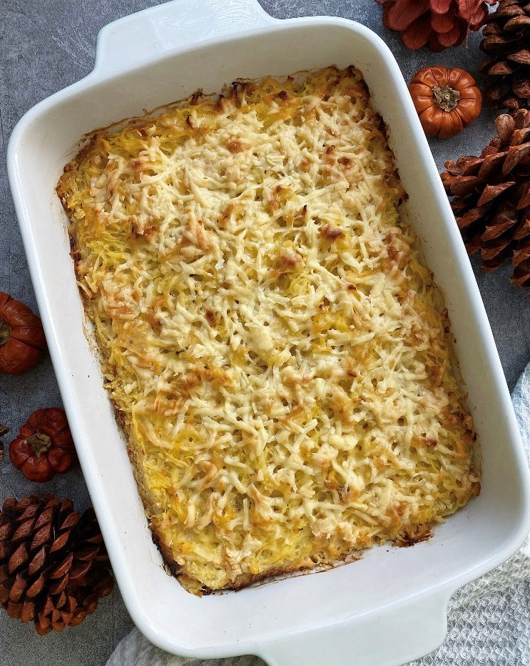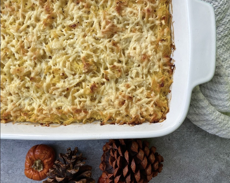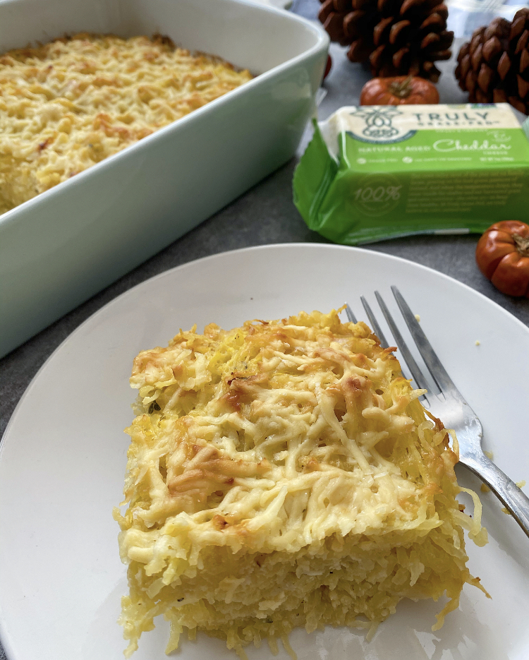 Once the squash is cooled use a fork to remove the flesh from the skin and place into the bowl with the onion and garlic mixture. Mix in 3/4 cup of the shredded cheddar cheese and the remaining ingredients reserving the additional 3/4 cup of shredded cheese for topping. Combine well and pour the squash mixture evenly into a 8 1/2 X 5 1/2 baking dish. Sprinkle the remaining shredded cheese on top. Bake in the oven for 45 minutes until hot, bubbly and golden. Serves 6-8
