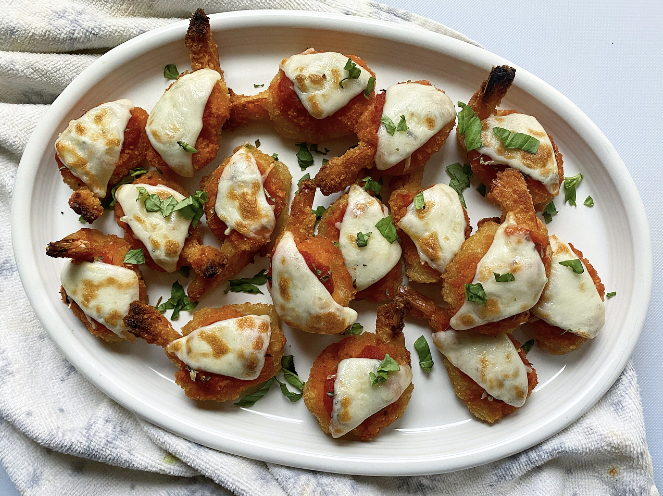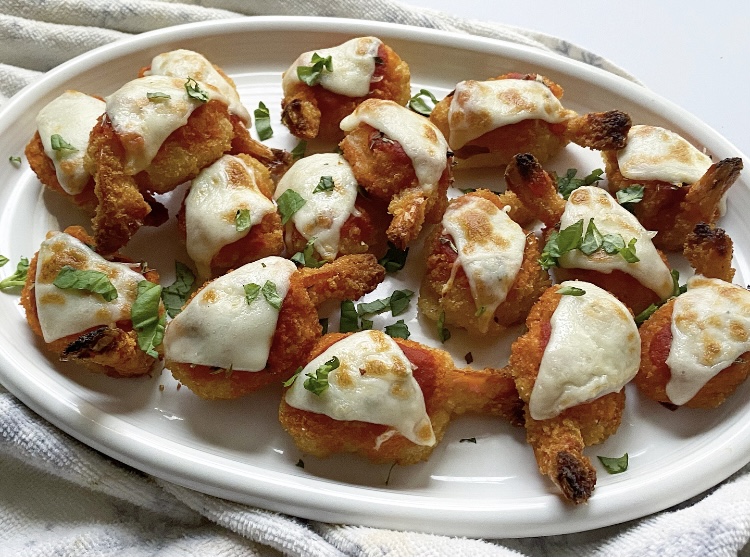 Preheat oven to 425 F.  Place the Gorton’s Frozen, Breaded Butterfly Shrimp at least one inch apart on a sheet pan. Bake in the oven for 18 – 20 minutes until the shrimp are lightly crispy and golden. Note: you can also air-fry the shrimp if preferred set to 400 for 10-12 minutes but I find it’s much easier to use the oven for this recipe. While the shrimp are cooking cut each slice of mozzarella into 4 squares then cut each square in half into small triangles. Once the shrimp are cooked remove from the oven and set the oven to broil. Top each shrimp with a teaspoon of tomato sauce. Sprinkle on some Italian seasoning and shredded parmesan if desired then top each prepared shrimp with a mozzarella triangle. Place the shrimp back into the oven and broil for 2-3 minutes until the cheese is bubbly and starts to brown.  Immediately remove from oven and serve immediately. Each 18 x 13 baking sheet makes approximately 16 Mini Shrimp Parmesans.